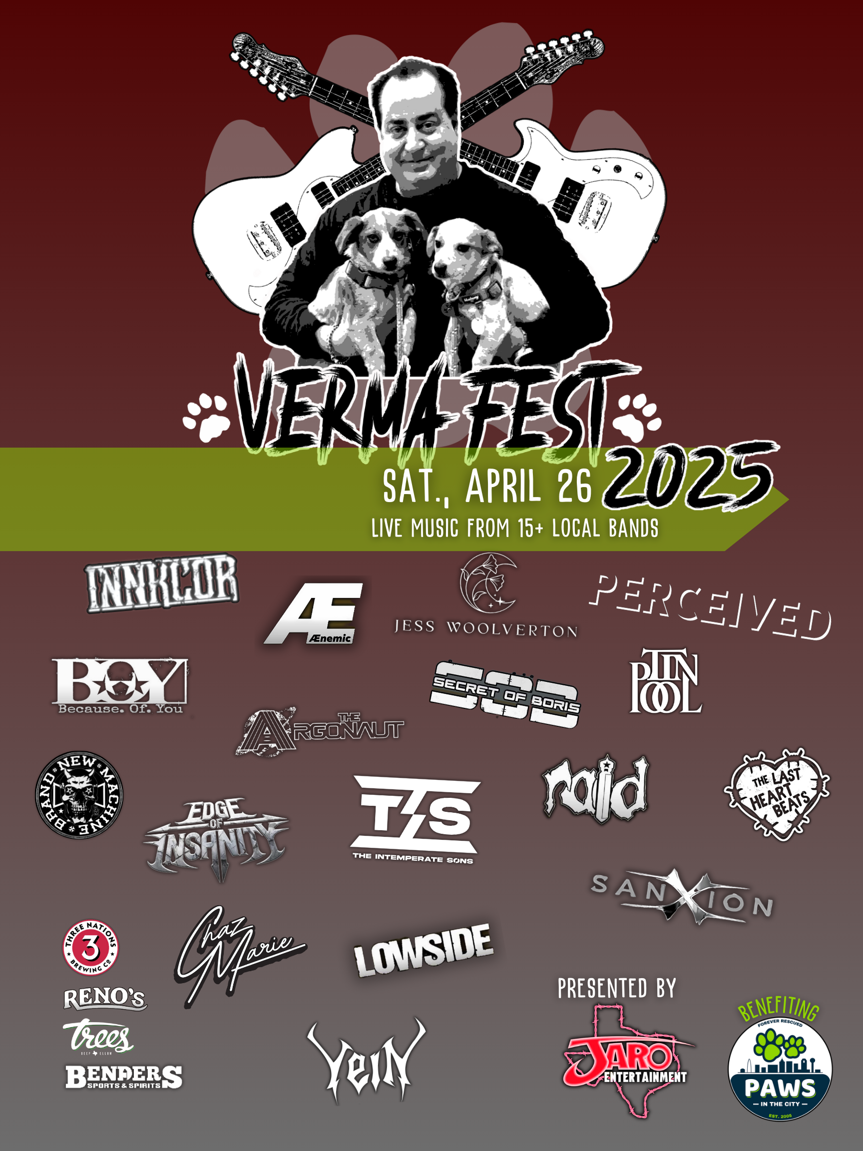 The Mark Verma Memorial Benefit Concert for Paws in the City affectionately known as VermaFest will be an all day celebration of the life of Mark Verma ending with a concert benefiting Paws in the City. This party will start at Benders Sports and Spirits Addison and 3 Nations Brewing in Carrollton and will conclude with 2 concerts in Deep Ellum at Trees Dallas and Reno’s Chop Shop. We will have 17 bands playing at the 4 venues mentioned above, there will be raffles at all locations and a very cool auction at Trees. You can pick up your tickets from any band member or at Reno’s or Trees. If you cannot make it out but want to support just hit the DONATE button for VermaFest. All proceeds will go to Paws In the City (Mark’s charity) in his name. Mark was a beautiful human who was loved by so many and deserves a fantastic celebration! Thanks for your support.